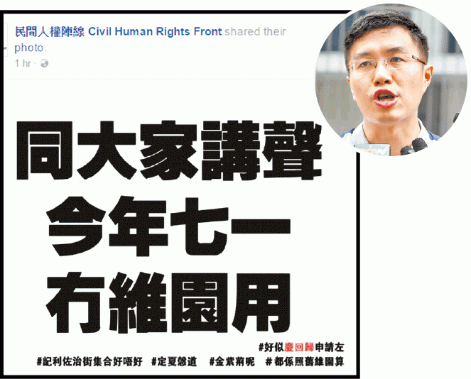 民陣今年7月1日大遊行,申請於維園足球場和草地作為起點,並以政府東翼前地(俗稱公民廣場)作為終點,並與以往一樣,於4月初入紙申請6個維園足球場作為7.1大遊行的起點,但康文署前日致電民陣,拒絕民陣申請,至於民陣同時申請了維園草地作為起點,則未有結果。