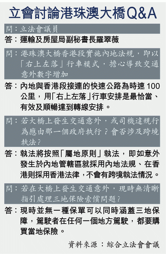 【本報訊】耗資逾千億公帑的港珠澳大橋工程預計年底完工,政府建議大橋內地與香港段連接的公路實施內地法規,即採取「右上左落」的行車安排。多名立法會議員關注若於大橋上發生交通意外,現時無清晰指引處理保險索償。運房局表明,現時並沒有一種保單可以同時涵蓋三地保障,但透露正與保監處研究,「會唔會同一地方買到兩種保險呢?」