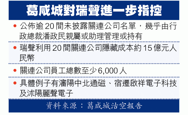 【本報訊】沽空機構葛咸城研究(Gotham City Research)再出招狙擊瑞聲科技(2018)!昨公佈完整版沽空報告,列出涉嫌未披露的關連公司名單,進一步指控瑞聲,藉這些公司隱藏成本高達15億元人民幣。分析認為,報告提及的關連公司指控是否成立,取決於該等人士持股比重及有否參與公司日常運作,瑞聲有未披露的嫌疑,但難以判斷是否違反上市規則。