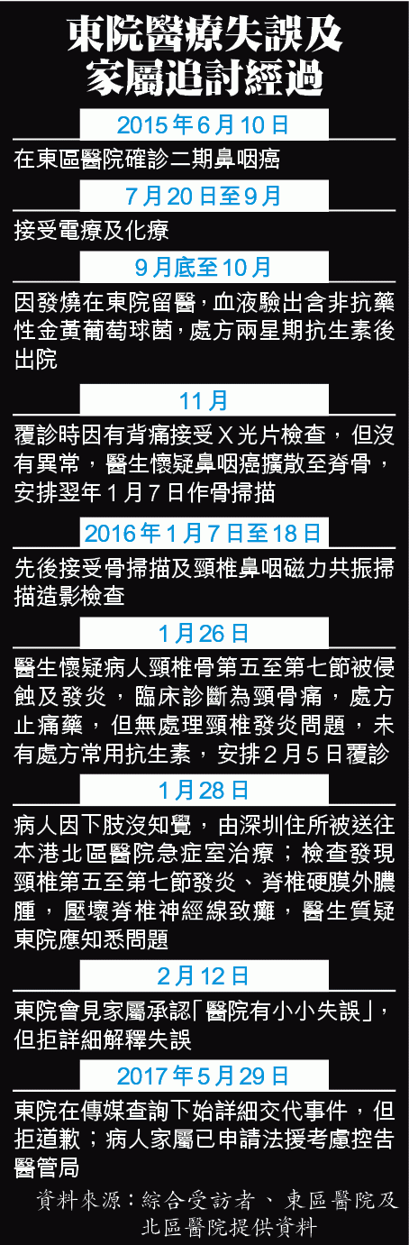 【本報訊】一名曾受金黃葡萄球菌入血的鼻咽癌病人,2016年1月突然下身失去知覺,送抵北區醫院後確診下身癱瘓。該名病人出事前2至3周曾於東區醫院接受過骨掃描及磁力共振,東院醫生懷疑他有膿腫及發炎,但沒處方抗生素。病人胞姊何女士狠批東院醫生「一啲醫德都冇」,「繼續落去咪好多病人俾你累死?」有專科醫生認為,如果醫生發現掃描結果有異或懷疑有病變而沒跟進,是有疏忽。