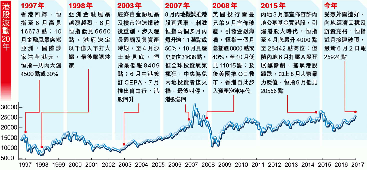 【本報訊】回歸廿載,香港資本主義不但沒有一夜轉姓「共」,金融市場更受惠中資南下而規模翻倍,港股市值由97年時約3萬億元,膨脹6.7倍至近25萬億元;然而風光背後,近年爭議湧現,外資憂慮香港為賺大陸錢而逐漸犧牲市場質素。本港多名金融界要員坦言,香港「最煞食」仍是法治優勢,須堅守原則和專業,香港人絕不會「冇碇企」。