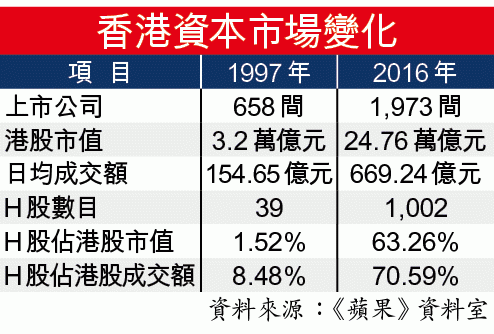 廿年來中、港交往更緊密,的確為本港金融市場帶來龐大收益。97年香港只有39家H股,佔港股市值僅1.5%;惟藉着內地「走出去」潮流,香港變為中資上市集中地,截至去年底本港已有逾千間內地企業上市,撐起港股63%市值。
