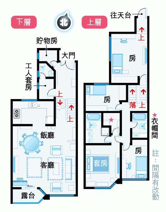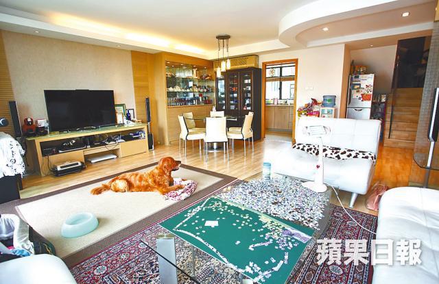 複式間隔經過改動,主要是廚房原則通往工人套房的樓梯被拆除,令廚房可用空間更廣。上層通往天台的原則偏廳則佈置成特大碼書房,並擺放睡床。單位廳房向東南望內園及附近山景,還有遠處一小片海景,天台向西北眺望香港教育大學附近一帶開揚山景。
