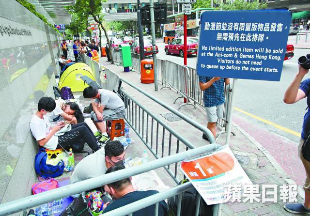 昨日會展外已有十多名市民排隊購買限量產品。頭位的何同學早於周二(25日)中午到場,目標是奪得Sony限量贈品43吋電視機,他笑言為了電視機才首次來動漫節,預算花數千元購買打機產品。