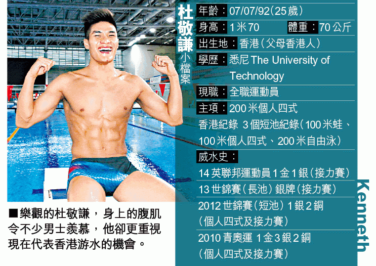 Kenneth去年失落里約奧運資格賽後,加上跟Kelly拍拖拍得火熱,決定來港;根據國際泳聯要求,轉換代表國家或地區要「過冷河」一年,上月一到「過冷河」期,他已急不及待在第一組短池分齡泳賽連破100米蛙、100米個人四式及200米自由泳三個港績。