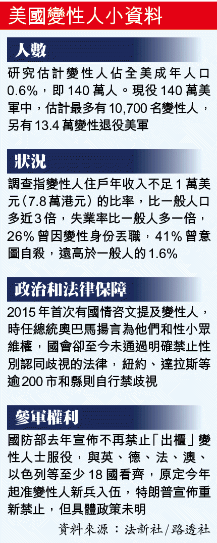 美國總統特朗普前天突然宣佈禁變性人從軍,震驚政軍界,受到多方批評,指他為討好保守派藍領,歧視性小眾,而且沒有執行計劃和充足知會就在Twitter宣佈決定,解答不了現役變性軍人前途的疑問,行事粗疏。