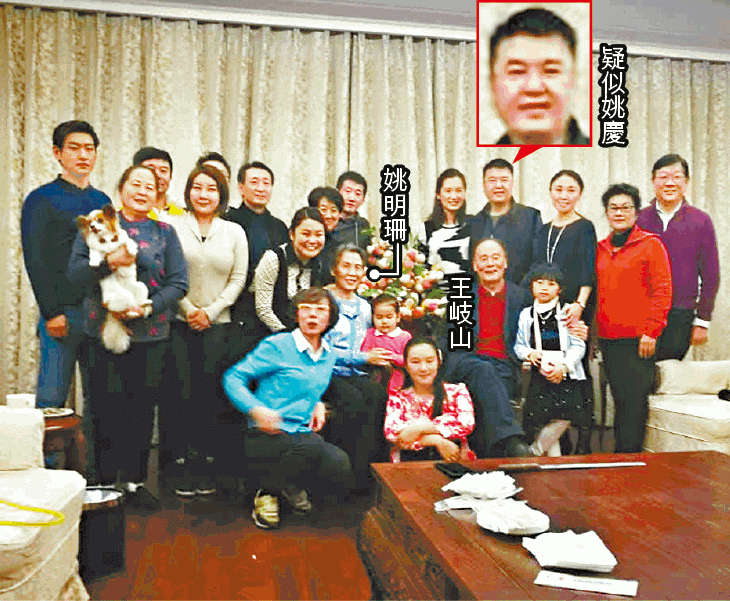 何頻昨午在Twitter發佈該幅王岐山家族合照,顯示王岐山家族一行20人齊聚於大紅酸枝矮桌後面,其中王岐山夫婦端坐正中,王身後站着的應是姚慶夫婦。而站在姚明珊旁邊的,據悉為郭文貴一直指稱是王岐山養女的孫瑤。