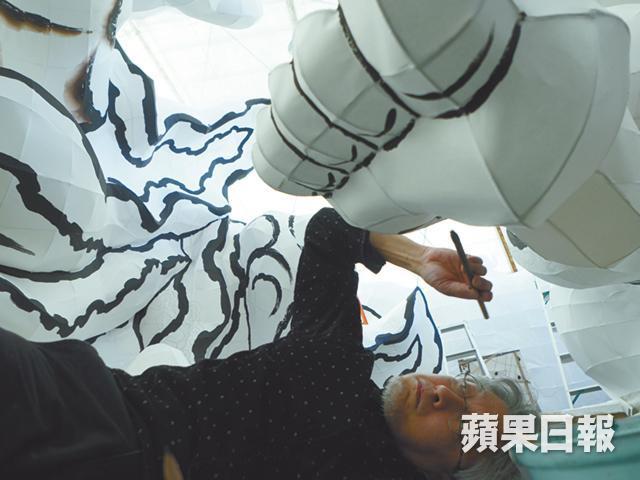 竹浪師傅說罷,就拿起一桶墨水,蹲在地上開始為模型的腳部勾畫邊線。上面的線畫妥後,接着又拿起一塊膠墊鋪在地板,這回他直接躺在墊上,繪畫腳板的線條,但這只不過是第一步,「每次完成主角的面部,就是我最滿意的時候。因為面部通常是整個燈籠最困難的部份,我必定會親自操刀。順利完成,即是代表整件作品也完成了。」