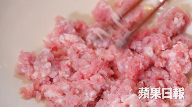 Step 1:為保持粉絲爽口,粉絲先浸半小時,然後加入沸水內,待水再次滾起後便能熄火及Step 2:豬肉以適量的老抽、生抽、麻油和胡椒粉醃好