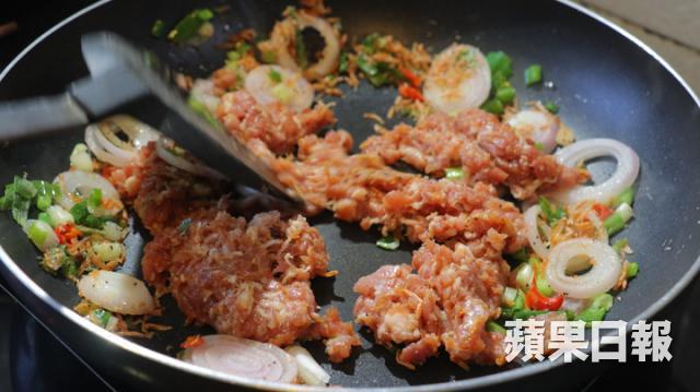 Step 3:爆香蔥粒乾蔥和蝦皮,再加入才醃好的豬肉