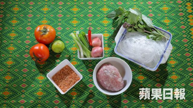 材料:粉絲 1扎、免治豬肉克250克、乾蔥 2個、青檸 1個、蕃茄 2個、蝦皮 適量、蔥 適量、九層塔 適量、花生 適量