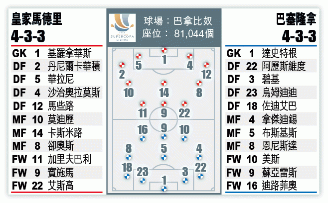 雖然首回合有明顯優勢,但皇家馬德里與巴塞隆拿關係勢成水火,周三西超盃次回合仍會大打真軍;以皇馬一眾小將的速率,就算有基斯坦奴朗拿度(C朗)停賽,仍力足再挫對手,平手盤撐皇馬。