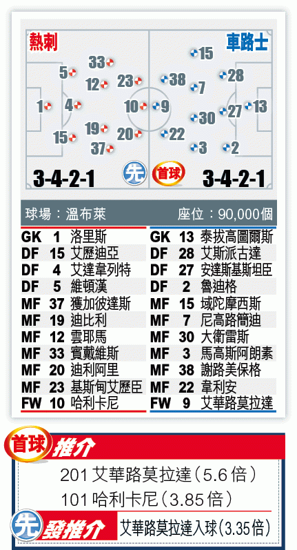 另外,熱刺上季於主場白鹿徑球場特佳,全季聯賽不敗,但今季移師溫布萊球場作為聯賽主場,卻未必可以繼續這個主場優勢,畢竟,熱刺上季以溫布萊作為歐聯主場,表現相當一般,在10場以溫布萊為主場的比賽輸掉六場,今役就算主力如前鋒哈利卡尼、中場基斯甸艾歷臣及迪利阿里等全部可以候命,但要讓球,始終凶險。