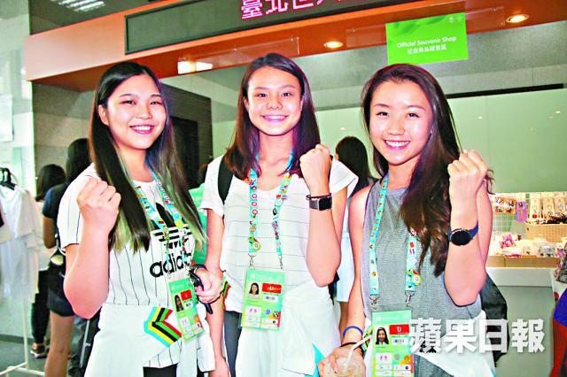 三個靚女一個墟,三位女子重劍小花連翊希、朱嘉望及何廸琳,昨日到南港展覽館的世大運劍擊場檢查器材前,先展示各人頸項上的「戰利品」,就是各海外選手的襟章,還帶大家到世大運紀念品檔攤,推介自己心頭好。