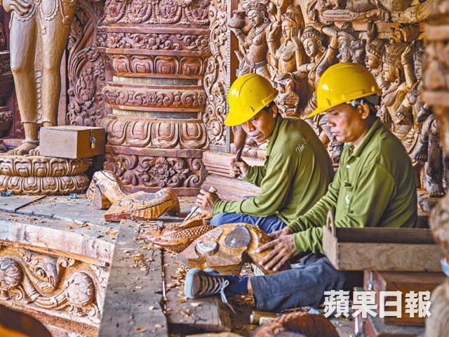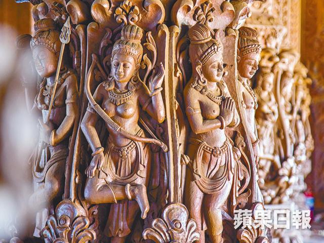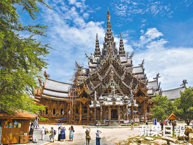 宏偉的真理寺由30年前開始興建,但部份外圍依然築起棚架,皆因工程至今仍未竣工,不禁讓人聯想起修建了144年的西班牙聖家堂。由於地理靠海,一邊的木雕長年受海風侵蝕,需不斷進行修繕,導遊指約多等30年便會完工。現時進入寺內,要佩戴頭盔保障安全。斥資動工的是一名泰國商人Lek Viriyaphant,可惜未等得及工程完成的一日便已離世,現交由兒子繼續管理。佔地23,000呎的寺用170支巨木柱撐起,牆上的圖案糅合中國、印度、泰國和柬埔寨的宗教色彩。內外由手雕刻裝嵌,親眼目擊過工人的鬼斧神工,把平凡的木頭精雕細琢成細膩的立體壁畫、木樑。寺頂部份先在平地砌合,再用吊索拉上高台。殊不簡單的工序,總共由250個工人協力。寺廟四面通風,從窗口透入日光,又或是窺探海景,意境唯美。