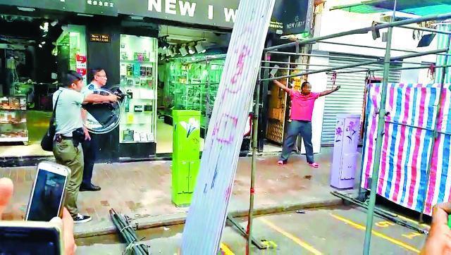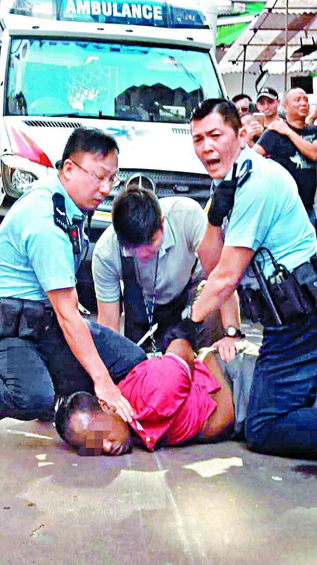 【本報訊】一名持行街紙留港非洲漢,昨午到油麻地廟街擬嫖妓,但入房後因沒錢付肉金,妓女拒提供性服務,有人不滿竟從廚房取刀指嚇一名清潔男工,持菜刀追妓女落街,斬傷一名男途人後,再與警員對峙數分鐘,警員擎槍戒備勸他放下菜刀及冷靜,但他情緒激動不受勸,更不停高叫「I want to die(我想死)」,並舉起雙手叫警員「kill me(殺我)」,其後警員向非洲漢噴胡椒噴霧,終合力將他制服,與受傷途人同送院治療。