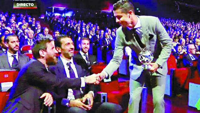 另外,歐洲足協同日頒發上屆歐聯最佳球員,冠軍皇馬成大贏家,莫迪歷及沙治奧拉莫斯,分別當選最佳中場及後衞,基斯坦奴朗拿度(C朗)「起孖」成為最佳前鋒及最佳球員,他在領獎後也大方與巴塞隆拿前鋒美斯握手;另外祖雲達斯的保方成為最佳門將。