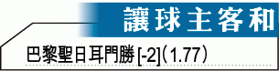 法甲開季四連勝的巴黎聖日耳門(PSG),雖然不乏南美兵,國際賽期耗力甚多,中堅堤亞高施華更加入傷兵名單,不過由摩納哥外借的新兵基利安麥巴比已準備就緒,周五聯賽作客榜尾的梅斯,半力也足以大數,「讓球主客和」[-2]也可熱捧「客勝」。(球賽編號:星期五24;無綫myTV Super303台明日2:45am直播)