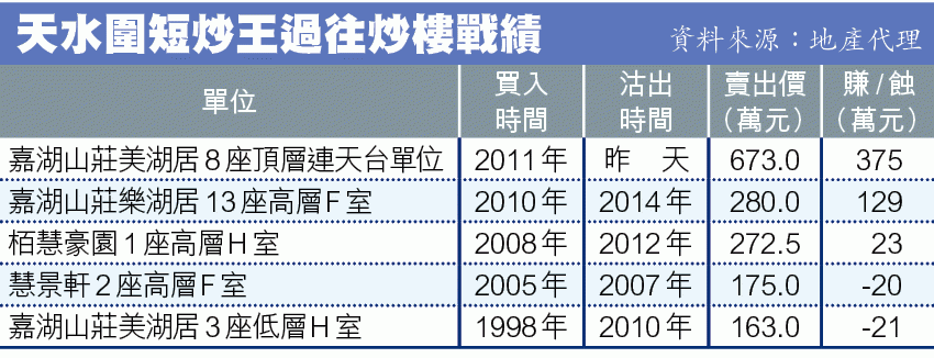 該炒家多年來投入炒賣天水圍物業的資金高達6,831.8萬元,已賣出的46伙,只有其中八伙蝕讓,但觀乎其「密食當三番」的戰績,每宗賺8萬元至129萬元,累計賬面賺1,179萬元。當中21伙持貨期不足1年,當中14伙更持貨半年或以下。其中嘉湖山莊麗湖居9座低層A室,2005年2月以120.8萬元買入,一個月以143萬元沽出,速賺22.2萬元。