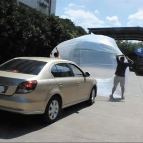 剛剛看到這條影片,覺得沿海的停車場遇着暴雨時可以買多個保險。打開袋駛車入內,之後四邊包好還可以加防撞軟墊,而且最後更有索帶可以固定汽車位置,看來萬無一失。之後上淘寶再看看,原來都有極像透明膠袋類的車套出現,聲稱完全防水,價錢由240人民幣至1,600人民幣不等,到底會不會入水?就算買了也應該不會想有測試機會。