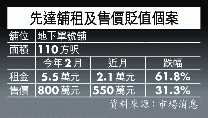 目前先達空置舖位約佔10%即28個。二樓租金最低只是4,000元,不過位於商場死角位置;靠近扶手電梯位置則大約1.1萬元。而一樓租金由6,000元起跳,較33年前高峯期最少要1.2萬元相比,已平足一半。地下商場內舖,月租2萬元已可租到一間100方呎舖位,比最貴時有六成折讓。租金急跌下,舖位轉售亦大幅貶值。地下的G單號舖,110方呎,今年2月原以800萬元易手,當時連一個5.5萬元租約。豈料電話舖不肯續租,交易告吹撻定收場。月前舖位以2.1萬元租出,較前租平3.4萬元或61.8%。近日舖位跌至550萬元沽出,較半年前低250萬元,平逾31%。