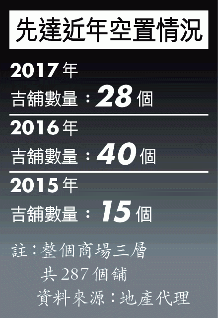 先達廣場3層合共287個舖位,在2015年iPhone 6s系列推出前夕,有約15個吉舖。但到2016年中,已急增至40間吉舖,不足一年吉舖數量飆升1.7倍。因空置率推高至14%,商場要大幅減租吸客,經過一年半時間調整,租金已比高位跌一半,空置率有改善。