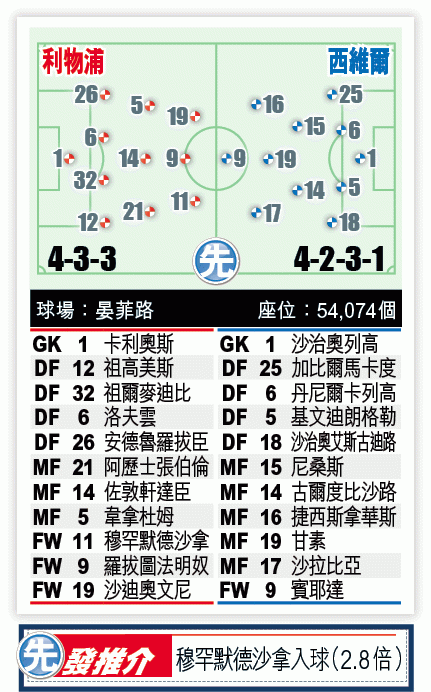 不過就算中後場變陣,前線始終要靠「埃及文明」三叉戟組合穆罕默德沙拿、沙迪奧文尼及羅拔圖法明奴,三人連拼多場現疲態,就算紅軍今季主場戰績優異,連同歐聯附加賽大勝賀芬咸,三戰全勝兼入九球,但今仗面對西維爾,難言穩勝。