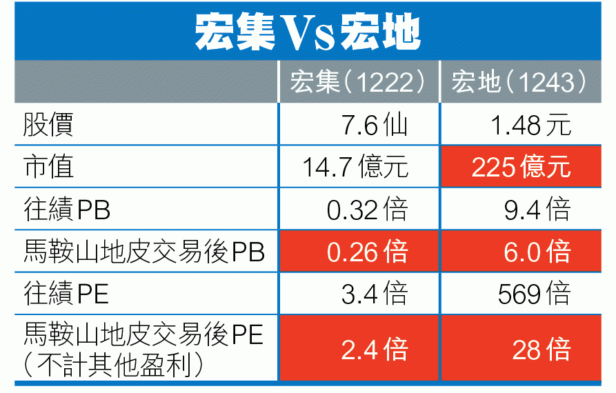 2)宏地今年3月底每股NAV0.16元,因馬鞍山地皮盈利及增值,NAV增至0.247元,PB由9.4倍降至仍屬不切實際的6倍(地產股王新地(016)預期0.82倍)。宏集NAV原為0.24元,因馬鞍山地皮交易而增至0.29元,PB僅0.26倍。