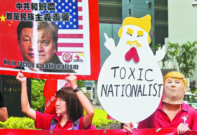 班農被視為是美總統特朗普的「操盤手」,從競選時的「美國優先」到執政後針對移民、及對華貿易的強硬政策。上月在爭議聲中辭任白宮,回到極右媒體任職的班農,昨出席本港中信里昂證券的投資者論壇並發表演講,會場外有十多名示威者高呼「不要班農!不要種族歧視!」有人帶着特朗普面具,又舉起寫着「這裏不歡迎納粹!」的橫額。而在班農口中,中國更接近納粹,《紐約時報》報道他前日赴港前受訪預告演講主題時說:「現在的中國就是1930年的德國……它正處在一個轉捩點、分叉路。中國年輕一代如此愛國,幾乎是極端民族主義者。」他宣稱:「一百年後,人們會記得我們為阻止中國稱霸世界所做的努力。」