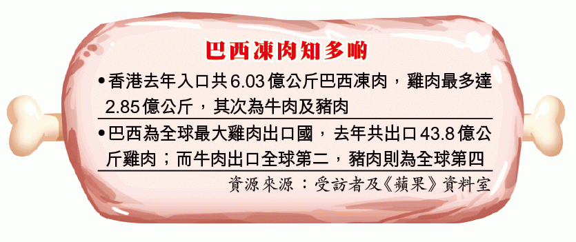 巴西今年初爆出疑黑心肉事件,截至7月,供港雞肉與去年相若為1.47億公斤,但牛肉及豬肉入口量都應聲下跌20%及14.9%,分別只有1億及0.83億公斤。不過,ABPA市場副主席Ricardo Santin稱事後農業部已馬上派員到各地屠房調查,未有發現違規,亦無發現腐肉,認為是巴西聯邦警察調查出錯。本港食安中心回覆指,3月起已於進口及零售層面加強抽驗由巴西進口的冷藏及冰鮮肉類和禽肉樣本,結果全部合格。