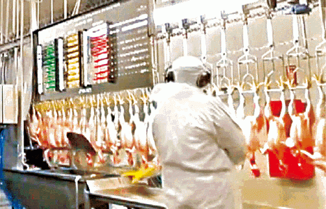 雞隻運到屠房後,要經過10道工序,始分發到各零售商或運往海外。首先將雞擊暈及放血,其後在不同機器間除毛及簡單分割,再送到各生產線。工人會戴防割手套切出雞胸或雞柳等,再送往包裝及冷藏。員工着上全套保護衣,專人打掃確保無積水或肉碎殘留地上。為免雞肉變壞,屠房內切割區溫度平均在10℃以下,儲藏區更為零下20℃,工人需額外穿羽絨保溫。廠房每日24小時運作,有1,600工人。
