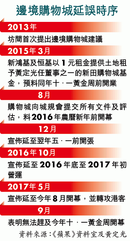 【本報訊】原定兩年多前開幕、針對內地旅客為目標客群的元朗邊境購物城,開幕日期一拖再拖。牽頭規劃購物城的民建聯立法會議員黃定光承認,工程有「甩漏」故延至9月中才向屋宇署申請入伙紙,料兩周後入伙紙到手可立即讓商戶進場裝修。不過,裝修估計最快需時10日以上,料不能趕及十.一黃金周營業,參與商戶也直言不抱期望做黃金周生意。