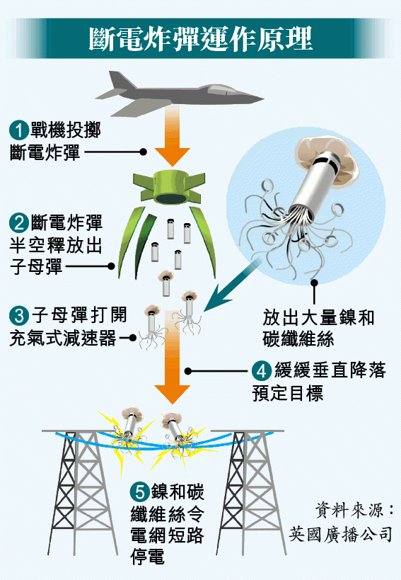 朝鮮半島局勢陰霾不定,南韓一方面極力避免韓戰重啟,另方面也做好最壞打算,修飭武備,南韓國防科學研究所已開發出斷電炸彈,若戰時投擲在北韓發電廠上空引爆,其高傳導性的鎳和碳纖維一旦接觸到電網便會造成短路,切斷其供電,可兵不血刃便癱瘓對方的核彈基地至少12個小時。