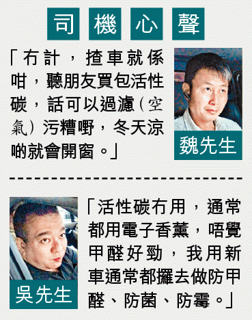 賴拒絕透露高污染車輛具體型號,但建議司機可打開車窗引進新鮮空氣,在過隧道或塞車時把它們關上,亦應避免使用含污染物的化學劑,車主可考慮換活性碳隔塵網,可減低污染物濃度。任職私人司機的周先生指,會盡量避免引擎空轉,如果車廂空氣焗悶,會盡量下車呼吸新鮮空氣。