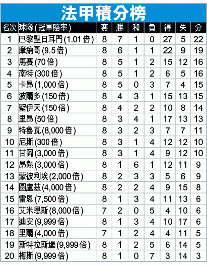 至於南特對手波爾多,風格完全迥異,八戰入15球失13球,包括國際賽前以2:6慘敗給聖日耳門,因此風格雖然華麗,目前卻只得15分排第六。