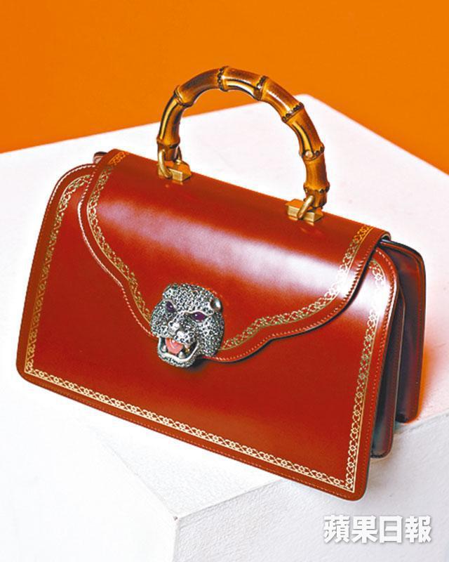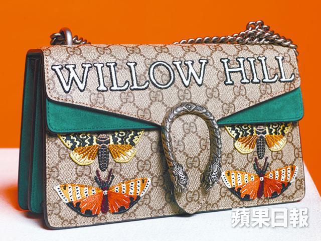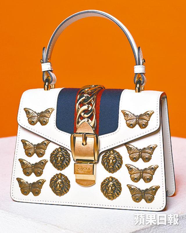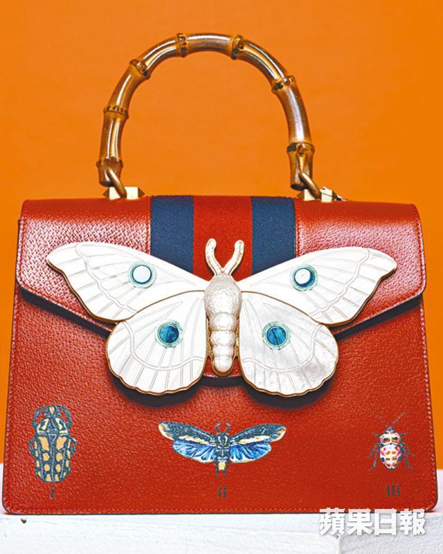 Gucci經典竹手挽今季更高調,配上招牌貓科動物頭金屬釦,袋身印上金色花紋框,貴氣加分。又將熱賣袋款Sylvie與Dionysus變成昆蟲圖鑑,袋身鋪滿飛蛾刺繡或金屬裝飾。