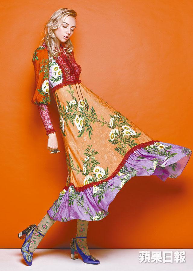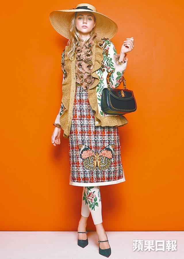 服裝上繽紛多樣的花卉圖案令人目眩神迷,格紋裙上又見大型蝴蝶刺繡,同時跟蟒蛇皮靴、昆蟲設計的首飾與手袋上的裝飾,串連出一個自然世界。