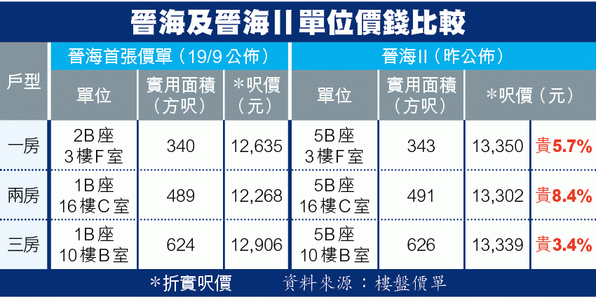 兩房戶實際加幅就更加大。晉海II第5B座16樓C室,實用面積491方呎,折實呎價13,302元,而上月推出的1B座同層C室,面積只差兩呎,開則幾乎倒模,呎價則為12,268元,昨日加推單位貴超過8%。