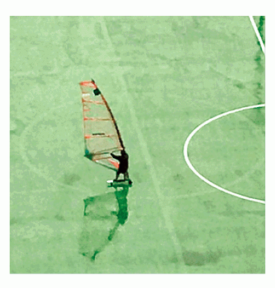 卡努襲港,天文台一早掛咗8號風球,有人冒險去海灘衝浪,怕危險又唔想去到咁遠?不如近近哋試吓落樓下球場玩喇!唔係講笑,噚日下午真係有位「風帆神之男」喺慈雲山中央球場「陸上行舟」(圖),仲滑足大半個足球場!