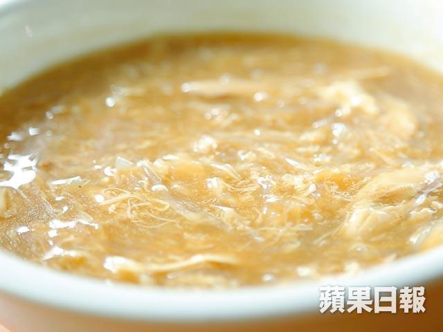 定好碗仔翅理想份量,然後放入同等份量雞湯。將蛋打勻並在湯滾時逐少加入鍋中,蛋花成形後加入元貝絲,再酌量放入胡椒粉。接着用豆粉水打芡,直至達到合適黏稠度,即可剪粉絲加入湯中。之後加入生抽調味,逐少下老抽調色。碗仔翅湯底混濁是常見難題,師傅透露秘訣在於加雞絲的時機,他說:「雞絲要在最後加入,因為烹煮過久會分泌肉糜,湯羹不會清澈。」拌勻即可上碟。