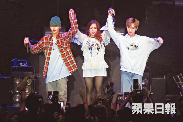 韓國「馬舞女」泫雅跟師弟團PENTAGON的Hui及E'Dawn組成「Triple H」,前晚於旺角麥花臣場館開騷,泫雅一出場即大晒美腿,之後除衫以小背心上陣,更行近台邊俯身拋胸,成功炒熱現場氣氛。泫雅全晚大騷美腿,除了跟師弟及男舞蹈員大跳辣身舞外,又不時講廣東話「多謝」及送飛吻冧粉絲。泫雅表演大熱的《BABE》、《Red》等solo歌外,又跟師弟合唱,會上三人邀請幸運粉絲上台玩遊戲,最後跟粉絲自拍及送抱。採訪:梁展雯攝影:葉君海