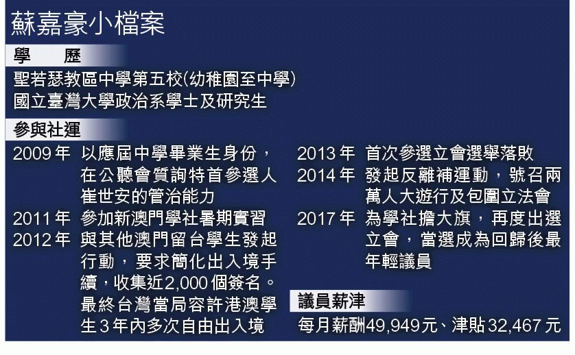 澳門新一屆立法會今天開鑼。現年26歲的蘇嘉豪,上月手握逾9,000票入局。這個澳門回歸以來首個90後議員,兒時非常百厭,「我係獨生子,屋企冇人同我講嘢,一返學就係咁撩人傾偈,幼稚園手冊印滿『雀仔』,即係好多言,好似雀仔咁嘈」。