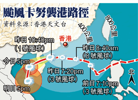 昨晨8時40分,天文台改發8號風球,至昨午2時許,卡努在香港西南約200公里掠過,風力進一步減弱,至昨晚7時20分改發3號風球,晚上10時40分再改掛1號風球,料今日所有風球將取消。