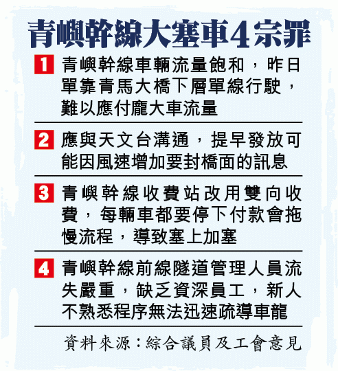 有議員及工會指今次大塞車十分罕見,並歸咎是4宗罪所致。香港隧道及公路幹線從業員總會主席卓和善認為,在車流量未減少下,單靠青馬大橋下層單線行車難以應付,加上青嶼幹線收費站改用雙向收費導致塞上加塞,而且青嶼幹線人手流失嚴重,新人手未必有足夠經驗確保臨時交通措施實施流暢。公民黨議員譚文豪表示,運輸署應該參考天文台風速預報,提前發出封橋訊息。