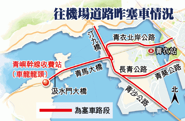 大批乘搭巴士及的士往機場的旅客如熱鍋上的螞蟻,有市民在塞車一個多小時後,索性在青衣北岸公路落車,拖着行李篋步行約一小時,至青衣站轉乘機場快綫往機場。深圳旅客張先生原本乘搭旅遊巴士直接從深圳到機場,但到達青衣時得知青馬大橋塞車,他果斷地在青衣下車轉搭機場快綫,「麻煩咗好多,要轉咁多輪車,又攞住咁多行李」。徐先生與太太在青馬大橋前塞了兩個多小時,昨午10時許才趕抵機場,幸趕得及上機,「好彩預鬆咗好多時間,唔係就大鑊,要改搭另一班機」。影星洪天明也受影響,需轉乘機鐵到機場。香港航空指昨天有5個航班共70名乘客因青嶼幹線封橋而未能及時抵達機場上機。