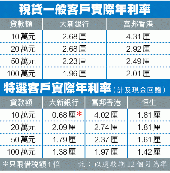 以大新銀行(2356)為例,雖然計及660元現金回贈後,最低息率僅0.68厘,但要同時申請出糧戶口,而且貸款額只限稅額1倍,上限10萬元。若然只是一般客戶,不申請其他服務,10萬元以下貸款的實際利率為2.68厘,足足多2厘。