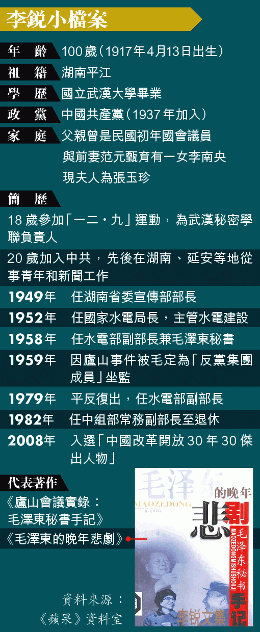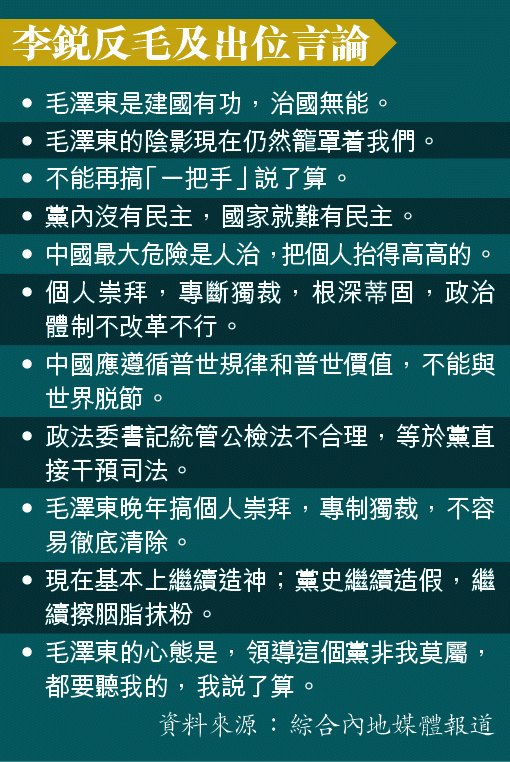 李銳作為中共延安時期(即30年代中共在延安轄據時)參加革命的元老,曾任毛澤東秘書、中組部常務副部長,地位尊尚,但因其對毛「不恭」及對中共多有批評,被視為黨內「異類」,退休後僅1997年十五大時獲以特邀代表出席。