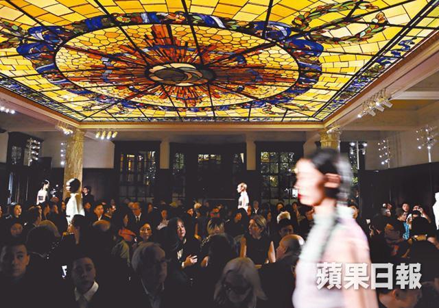 七彩玻璃天花、手工地磚、古木窗花,模特兒穿上新裝在點點銹迹的巨鏡前,來回穿梭,有一份穿越古今的夢幻歲月味道。