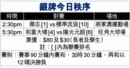 【本報訊】高級組銀牌八強戰今日展開,衞冕的傑志會迎戰標準流浪;近況不俗的和富大埔會與另一區隊陽光元朗爭入四強。