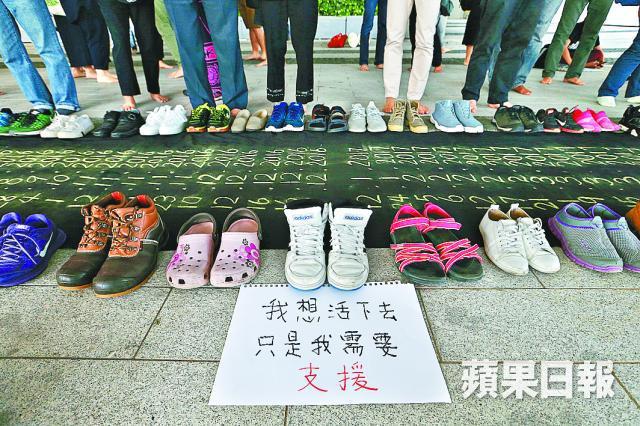 【本報訊】過去兩年多共有74名學童自殺,過百人昨日參與「紀念被遺忘孩子」遊行,赤足走向特首辦,手持象徵「孩子」的一雙又一雙鞋子,靜默「哀」行。他們促政府盡快檢討教育制度及成立跨部門小組,解決學童自殺問題。
